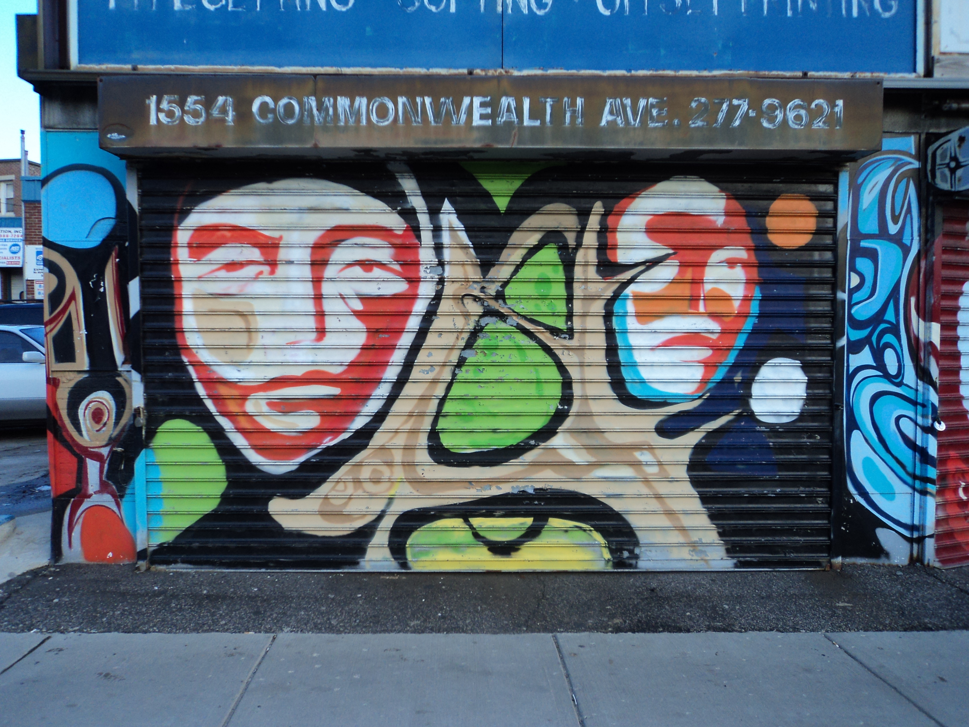 I took this picture yesterday on my way to Tasca’s in Brighton. These storefronts are sandwiched between Melvin’s pharmacy and a shady gas station around 1600 Comm Ave, at the summit of the giant hill between the Washington and Warren T stops on the B line. It looks like the same graffiti artist who did the grates over at The Silhouette on Brighton Ave in Allston. I used to live on Summit Ave in the saddest apartment in all of Brighton, with a strictly ornamental AC in the wall and bed-bugs the size of dimes. It was a dark yet wonderful time, but we couldn’t be happier to have changed neighborhoods. We still trek up to Tasca’s for the best tapas in town every couple months, but walking up that hill is a chore I avoid at all costs. Some of the only things about this corner I miss is Melvin’s pharmacy, the closest place to get a pint from the train to my apartment, and this graffiti, making this one of the only vacant storefronts I support in this end of town.